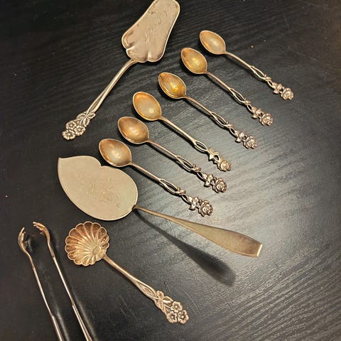 Myyntiin Nilsjohanin valmistama Handelns Gård aterinsetti Ruotsista. Kauniisti koristeltu varsi. Setti on alpakkaa eli ravintolahopeaa, ja ensipuhdistuksen jälkeen käyttöä yhä näkyvissä. Itse voi halutessaan puhdistaa lisää.