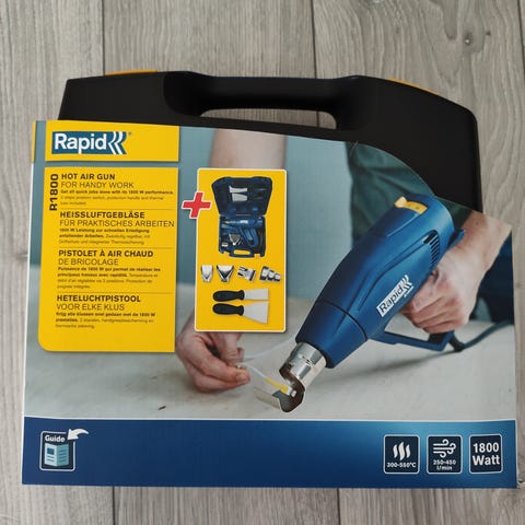 Uusi kuumailmapuhallin setti – Laatikossa ja tarvikkeilla
