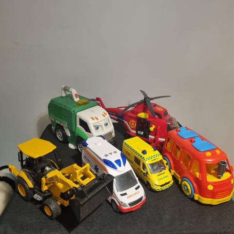 Myydään leluja: poliisiauto, helikopteri (molemmat tekevät ääniä), roska-auto (patterit loppui), lisäksi myös 3 autoa