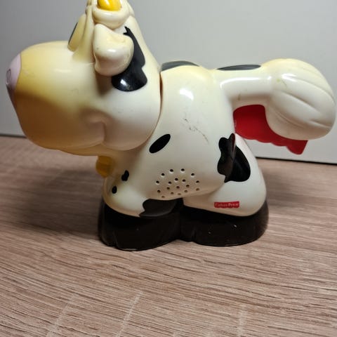 Little Tikes lehmä-taskulamppu. Muovinen eläinhahmoinen taskulamppu, jossa kantokahva päällä ja valaisinosa suun kohdalla. Soveltuu lasten käyttöön esimerkiksi leikkeihin tai pimeässä liikkumiseen sisällä ja ulkona. Toimii paristoilla (paristot eivät näy kuvissa).