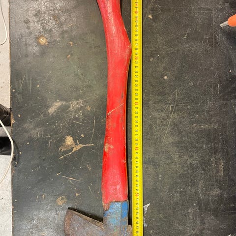 Billnäs 1222 kirveenpää. Metallinen kirveen teräosa, jossa osittain näkyvissä punainen maalipinta. Varren jäänteet ovat kiinni terässä, mutta varsi on käytännössä uusimisen tarpeessa. Sopii esimerkiksi kunnostettavaksi ja varustettavaksi uudella varrella puutöihin tai yleiskäyttöön.