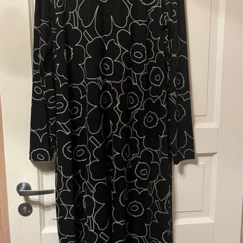 Marimekko naisten mekko, koko L. Pitkähihainen malli, valmistettu viskoosista ja elastaanista. Mekossa on musta pohjaväri ja unikkokuosi. Pyöreä pääntie. Mukava päällä, joustaa. A-linjainen. Itselle harmillisen isoksi jäänyt.