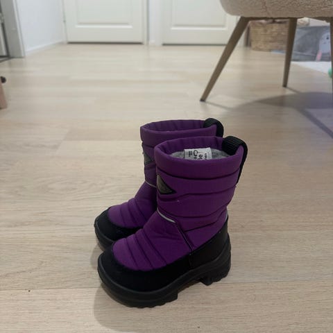 Kuoma lasten talvikengät, koko 22. Unisex-malli, tummansiniset varret ja musta kumipohja. Kengissä on lämmin vuori ja paksu, kuvioitu ulkopohja. Sopivat kylmään säähän ja ulkoiluun lapsille, joille kengän koko 22 on sopiva.