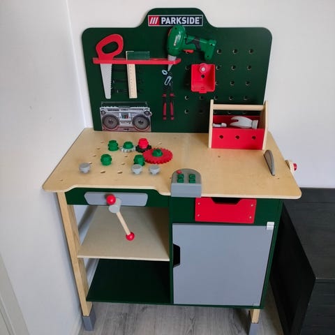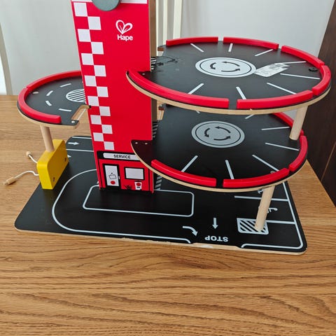 Hape leikkiparkkihalli puinen. Kaksikerroksinen parkkihalli, jossa ajorampit ja ajoreitit leikkiautoille. Mukana kaksi autoa. Kaikki toimii, vaikkakin tällä on paljon leikitty