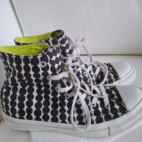Kuvanmukaiset Converse x Marimekko kengät unikkokuosilla. Konepestyt, nauhoissa tummaa käytön jälkeä joka ei pesussa lähtenyt. Kuvista näet tarkemmin kunnon. Kengissä paksut pohjalliset. KOKO 42.5