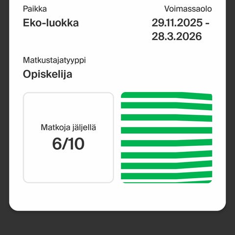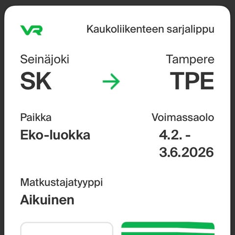 3 opiskelijan sarjalippua Lapua–Pasila. Käy molempiin suuntiin. Voimassa 27.4.2026 asti. Joudun tekemään varauksen omalta tililtäni, annan sitten linkin VR:n sivuille lippuun.