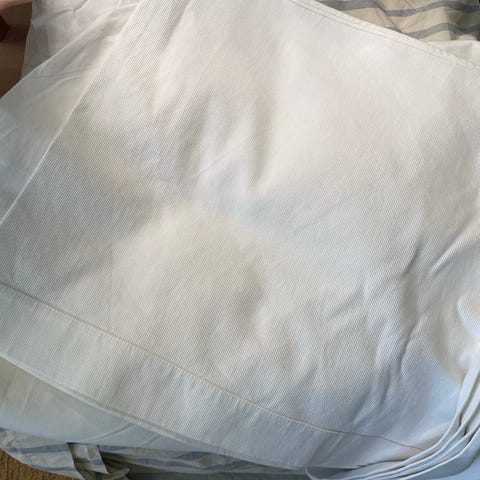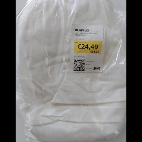 Valkoinen helmalakana. Pari tahraa kuvissa. Pesun jäljiltä ryppyinen, pesty hajusteettomasti. Sopii ymmärtääkseni 180cm leveään sänkyyn, meille oli liian iso 160cm leveään.
