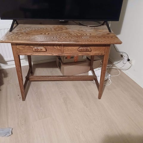 Hyväkuntoinen työpöytä, yhdestä vetimestä hiukan pintaa rikkoutunut. Avaimia laatikoihin ei ole, laatikot auki.