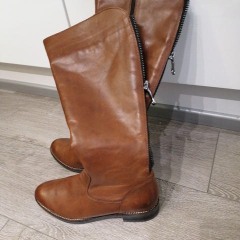 Remonten uudet ruskeat saapikkaat, koko 38. Polvipituiset saappaat, joissa sivussa vetoketju helpottamassa pukemista ja riisumista. Takana myös avattava vetoketju koristeena. Päällinen on sileää materiaalia ja pohja kumia, jossa kuviointi lisää pitoa. Malli sopii arkeen ja yleiskäyttöön syys- ja talvikaudelle. Kengän koko on valmistajan merkinnän mukaan 38. Postitan.