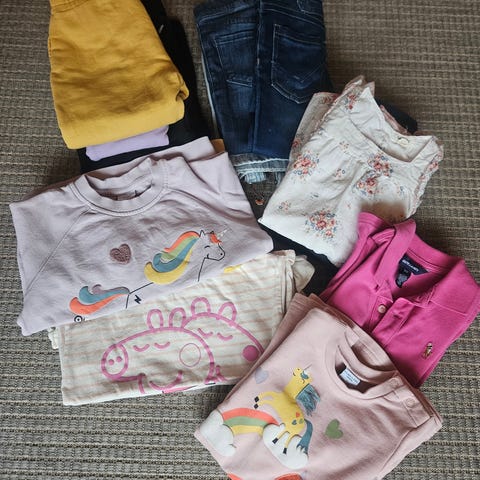 Hyvässä kunnossa oleva vaatepaketti tytölle koossa 92, pieniä käytön jälkiä voi löytyä.
