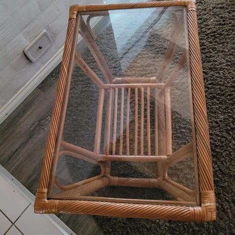 Rottinkipöytä lasilla ja kolme tuolia. Hyväkuntoiset. Pöydän halkaisija lasilla 64 cm ja korkeus 64 cm.Hinta 20 euroa.