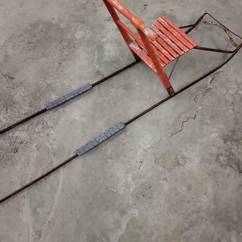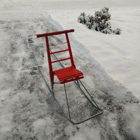 Punainen lasten potkukelkka, korkeus 60 cm.