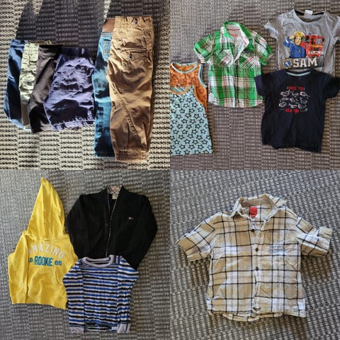 Vaatesetti koossa 98-104. Parissa vaatteessa kokomerkintä 110, mutta olivat meillä käytössä jo koossa 104.