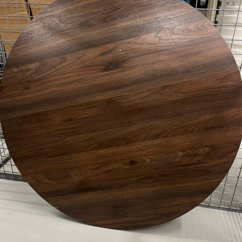 Jyskin RINGSTED Ø100 musta saarniviilu ruokapöytä ja kaksi tuolia. Näkyviä naarmuja ei ole,