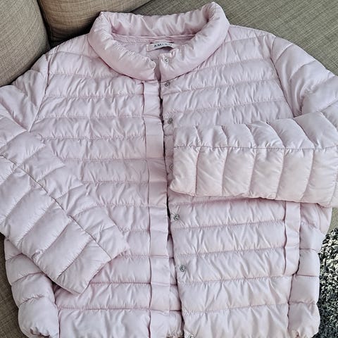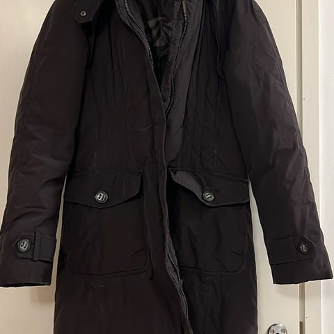 Ihana, pitkä untuvatakki, joka vaatii korjausta. Kangas ja vuori ehjät, mutta vetoketju täytyy vaihtaa ja taskujen tekonahkareunukset ovat rispaantuneet.