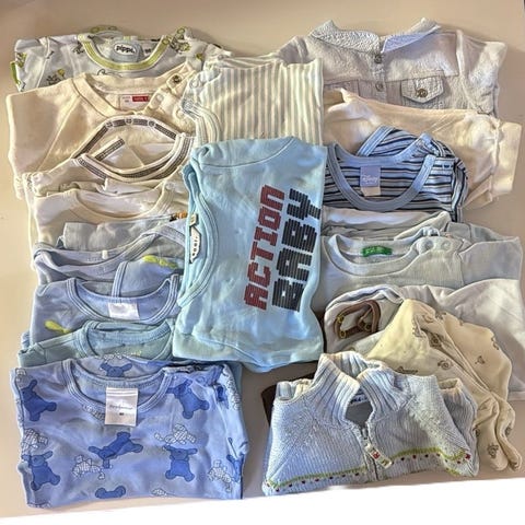 Vaatepaketti vauvalle kokoa 50-56. Osa ostettu uutena ja osa käytettynä. Kaikki pesty hajusteettomasti, rypyssä säilytyksen jäljiltä.