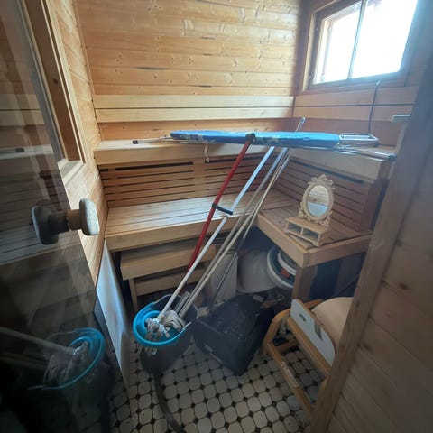 Metallirunkoinen ja lasi-paneelinen lyhty joka ollut lamppu. Osat irrallaan, osaava voi askarrella näistä toimivan.