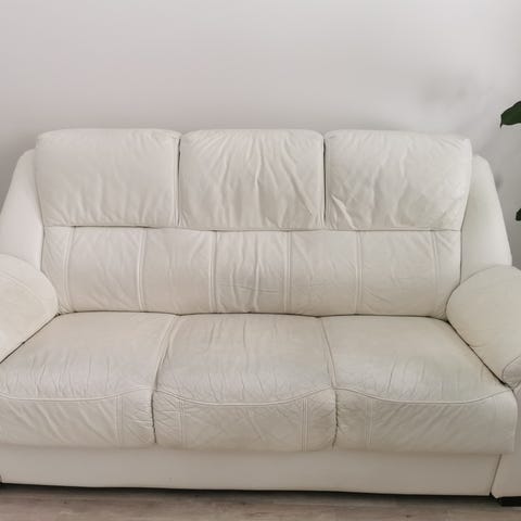 Käytetty ehjä valkoinen nojatuoli, aitoa nahkaa. Kulumaa käsinojissa. Puhdistan vielä nahkan puhdistusaineella.