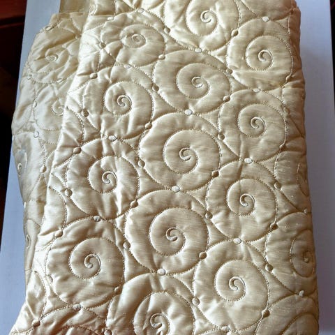 Samettimainen pinta, yksi valkoinen tahra noin 80 cm päässä reunasta. Kuvassa Fiskarsin sakset kertomassa tahran kokoluokasta