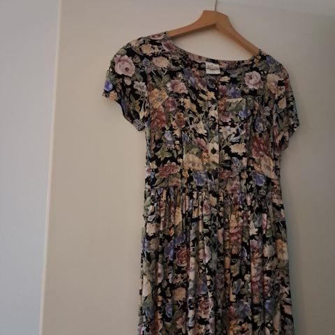 Vintage kukkamekko. Materiaalina viskoosi. Mekossa on kirjavan kukkakuvioinen kangas ja lyhyet hihat. Edessä nappikiinnitys. Kokomerkintä 40, mutta pientä kokoa ja lyhyt malli.