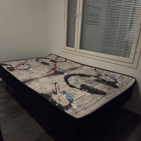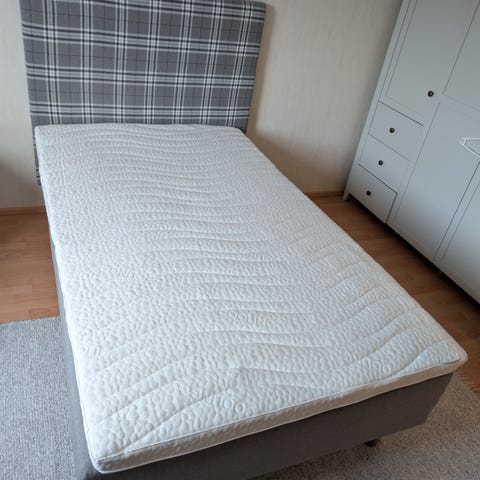 Todella hyvässä ja siistissä kunnossa oleva 120cm leveä sänky vasta ostetulla dreamzone joustinpatjalla.