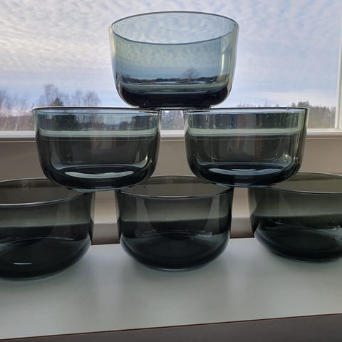 1950-luvun lopulla meidän perheen vierasastiastoon kuuluivat kuvien värilliset kulhot, lautaset ja iso malja. Olipa niistä mukava maistella hedelmäsalaattia ja Viri-vanukasta vieraskutsuilla joita virkamiesperheessä silloin tällöin järjestettiin. No nyt on aika luopua tuosta tunnetun suomalaisen mm. lasitaiteilijan Saara Hopean Nuutajärven lasitehtaalle suunnittelemista värikkäistä esineistä etteivät unohdu vitriinin perälle.