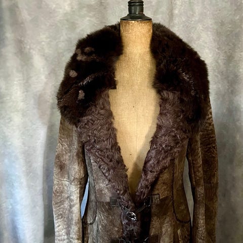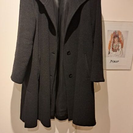 Upea, pitkä naisellisesti hieman muotoon leikattu tummanruskea kelsiturkki muhkealla kauluksella ja hihansuilla. Suljenta yhdellä puutapilla edestä. Sivuilla piilotaskut. Materiaali keinomokkaa ja keinoturkista. Kokomerkintä L, mutta espanjalaisena mallina hieman sirompi, sanoisin kokoa M/L.
