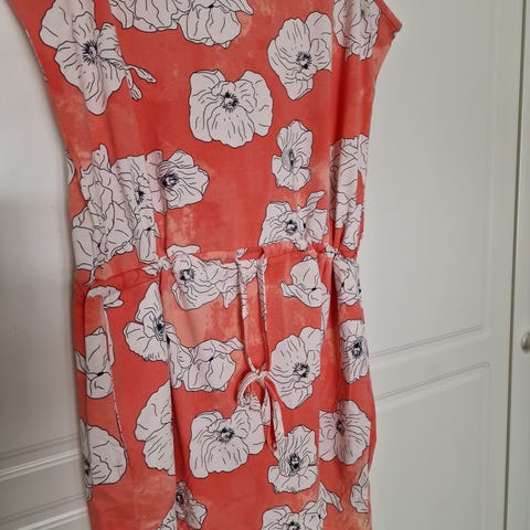 Cellbes naisten kesämekko, koko 42/44. Hihaton malli, edessä koristeena nappilista koko pituudelta. Väri oranssi. Materiaali viskoosi-polyesteri. Mekossa on kevyt, hieman teksturoitu pinta. Sopii käytettäväksi arjessa ja kesäkäytössä esimerkiksi sellaisenaan tai neuletakin kanssa.