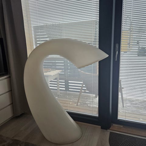 Eero Aarnio Swan XL valkoinen valaisin. Polyeteenistä valmistettu 130 cm korkea valaisin on harvinainen ja näyttävä sisustuselementti. Ollut sisäkäytössä. Todella upea valaisin!