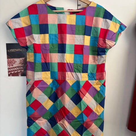 Marimekon monivärinen Pussukka peukku -mekko, kunto erinomainen. Koko XL. Materiaali puuvilla.