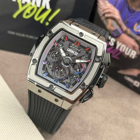 Huomiota herättävä miestenkello URBN22. Kellon tekniikka perustuu kvartsikoneistoon (VD53, valmistettu Japanissa).Varustettu kronografilla, 24 tunnin näytöllä ja päivämääränä klo 4–5 välissä.Huomiota herättävä ulkonäkö kotelon muodossa, osittain avoin kellotaulu ja värikkäät yksityiskohdat.Kello lepää mukavalla teräksisellä rannekkeella.Kello toimitetaan esitettyjen (valkoisten) tarvikkeiden kera.Koneisto: kvartsiaKotelon materiaali: terästäläpimitta: noin 42 mm ilman kruunuapaksuus: noin 12 mmranneke: noin 21 cmIkä: 2020+Toimitetaan vakuutettuna.Kuvat ovat osa kuvausta.