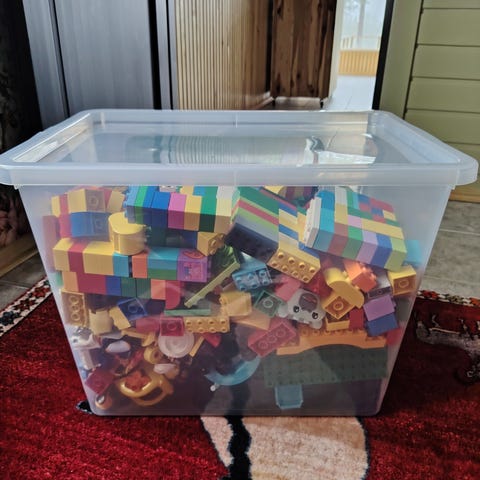 Sekalainen setti vanhoja duploja. Paljon perusrakennuspalikoita ja lisäksi erikoispalikoita. Vaunut kaikki rikki toisesta päästä, muuten ehjiä. Kuvat kuluneita.