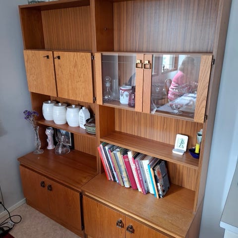 Poul Hundevadin suunnittelema vaaleatamminen tanskalainen 1960-luvun kirjahylly säädettävillä hyllyillä. Kaappi on loistokunnossa.