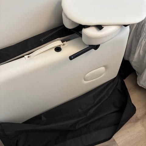 Sininen hierontapöytä, toinen pääty nousee, käsituet sivuille ja kasaantuu matkaan mukaan otettavaksi.