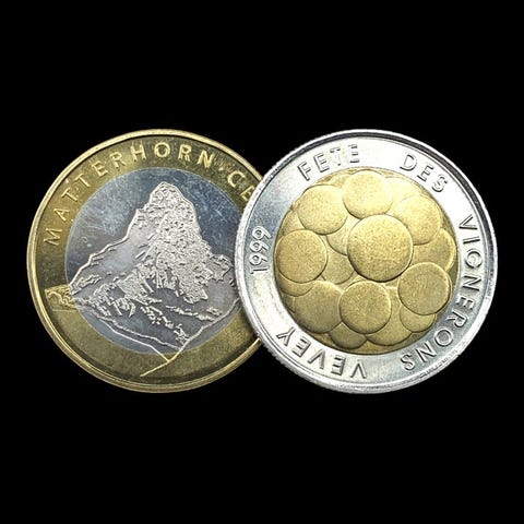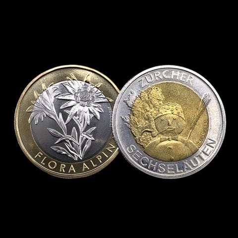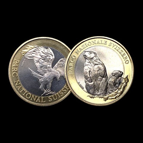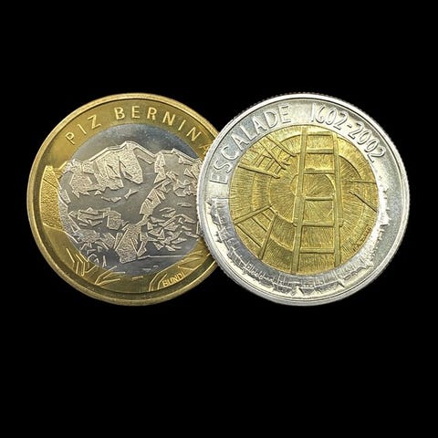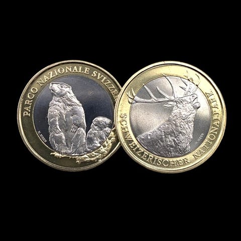Sveitsi. 2 Bimetallic Non-Circulating Coins: 1x 5 Francs + 1x 10 Francs (Swiss