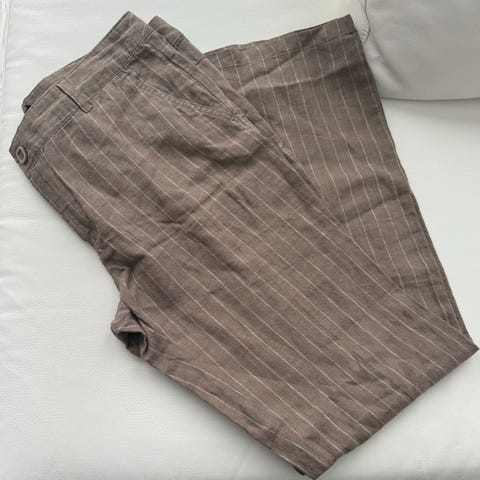 Laadukkaat vaaleanruskeat/pellavan väriset kesähousut. Caprimittaiset. Hyväkuntoiset. Joustovyötärö. Leveähköt lahkeet, joissa halkiot.