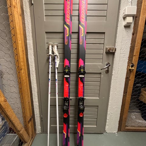 Myynnissä laskettelusuksisetti. Mukaan tulee laskettelusukset siteillä. Suksissa musta pohja ja koristekuvioitu yläpuoli, siteet valkoiset/harmaat sekä valkoiset laskettelumonot koko 38 ja punaiset sauvat.