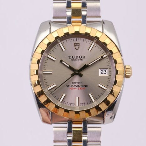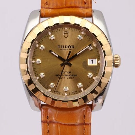 - // HUOMIO BIDAIJALLE // - Kun kello on varustettu jälkimarkkinoilta ostetuilla osilla tai toisen mallipohjan alkuperäisillä osilla, kello katsotaan räätälöidyksi kelloksi. Tämä tarkoittaa, että kellossa voi olla osia, jotka poikkeavat alkuperäisen tehtaan teknisistä tiedoista. Räätälöinti voi vaihdella laajasti, joten korostamme seuraavat mahdollisuudet täyden läpinäkyvyyden vuoksi:- Jälkimarkkinan osat - Kellossa voi olla kolmannen osapuolen komponentteja (esim. kehä, pelti, osoittimet, safiiris, ranneke ja jalokivien asetukset), joita ei valmistaja itse toimita. Nämä osat lisätään usein esteettisistä syistä, mutta niitä ei valmistajan toimesta pidetä alkuperäisinä.- Alkuperäiset osat muualta mallista - Jotkut osat (esim. viisarit tai ranneke) voivat olla peräisin muista samaa brändiä olevista oikeista kelloista. Vaikka osat ovat aitoja, niitä ei ole alun alkaen asennettu tähän tiettyyn malliin tai viitteeseen, mikä voi vaikuttaa keräilyarvoon tai valmistajan huoltopalvelun kelpoisuuteen.- Ei-alkuperäiset osat - Joissakin tapauksissa räätälöidyissä kelloissa voi olla osia, jotka eivät ole eivät alkuperäisiä eikä valmistajan valmistamia. Nämä osat voivat vaikuttaa kellon arvoon.räätälöidyillä kellolla ei välttämättä ole oikeutta valmistajan viralliseen huoltoon tai takuun piiriin. Kaikki tarjouksia tulisi tehdä tietoisina yllä kuvatusta räätälöintiasteesta.===========================================================================—// KUVAUS //—Malli: Tudor Classic Date 21013 Gold Linen Dial Men's Automatic Watch Alkuperä: SveitsiMateriaali: ruostumaton teräsEtukellon väri: kultainen pellavakuvioinnillaKellon tapauksenkoko: 36 mm ( ilman seittää )Mitoitus: mahtuu ranteeseen noin 18,5 cm asti. Ei lisälinkkejä.Liike: Tudor (ETA) 2824-2 automaattinen liikeVirranvaraus: ~38 tuntiaToiminnot: ajanluku, automaattinen ja manuaalinen winti, viileävä osoittimet, päivämäärän näyttö, ruuvi-laskennallinen kruunu, hehkuvat osoittimet ja tuntimerkinnät.** Vedenkestävyys ei ole tarkastettu tässä kellossa. Ei suositella uintiin tai sukeltoihin. Varovaisuutta käyttäessäsi kellon veden läheisyydessä **—// TOIMITUS SISÄLTÖ //—Alkuperäinen laatikko: Ei *(sisältää jälkimarkkinakellon laatikon)Alkuperäiset paperit: Ei —// TILANNE //—Kotelon kulutus | ORIGINAALI | : Pieni *(Mitä pienet hiushalkeamat, kevennetyt kulumat ja kulut sivuilla.)Kotelon takakannen kulutus | ORIGINAALI | : Pieni *(pienet hiusvarashikirrat ja kevyet naarmut)Kellon lasin kulutus | ORIGINAALI | : Mitätön *(Alkuperäinen safiirilasi.) Kellon laidan digisivun kulutus | ORIGINAALI | : Mitätön ("SWISS MADE" tulostettu klo 6 kohdassa, tulosteet kunnossa. Luminestien napit ehjiä.)Kello- ja osoittimien kulutus | ORIGINAALI | : Ei / MittavaKehyksen kulutus | AFTERMARKET | : Ei (jäljitelmä kultaa päällystetty metallikehä)Kruunun kulutus | ORIGINAALI | : Pieni / Keskikokoinen (Alkuperäinen Tudor Kruunu kilpi-symbolilla. Näkyviä kulumia naarmuja, toisella puolella puristusta varten litistetyt sormilihaksen kierteet. Kuurnan kiertötoiminto OK noin 1,5 kääntöa.)Rannekkeen tai -nauhan kulutus | AFTERMARKET | : Ei (Jäljitelmä nahkarannekkeet jäljittelymetallilukolla)KOKOELMAININEN TILANNE RATING:Ei käytetty (Paras) > Merkittävästi merkityksetön > Pieni > Keskikokoinen > Raju > Vaurioitunut (Worst)— // TIMING-TEHTÄVÄ //—Arviointi: -13 sekuntia päivässä(näytetään +/- sekuntia päivässä, osoittaen kellon men