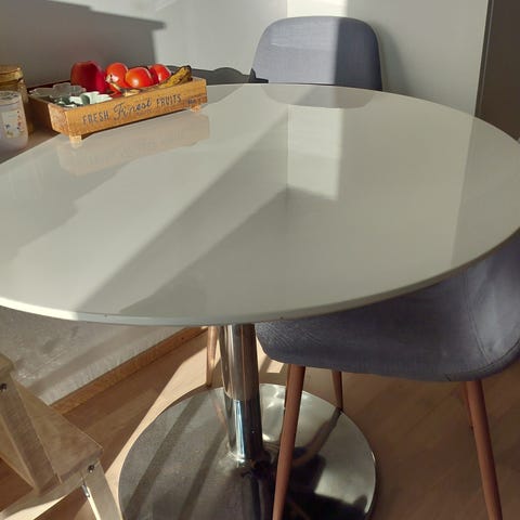 Pöytä päältä tahrainen ja muutamat naarmut pinnassa. Jalka hieman löysällä, mutta se on varmasti helppo korjata. Nouto ennen maanantai-iltaa
