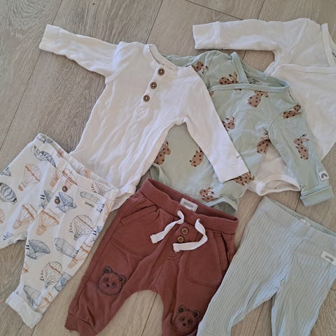 Harmaa body h&m, newbie body eläinkuviot, vaalean vihreä body ciraf, peuhun puuvillaneule, housut moomin ja h&m. Ihana paketti pojalle. En löytänyt moitteita. Siistissä kunnossa. Neule vain pari kertaa käytetty. Eläimetön talous.