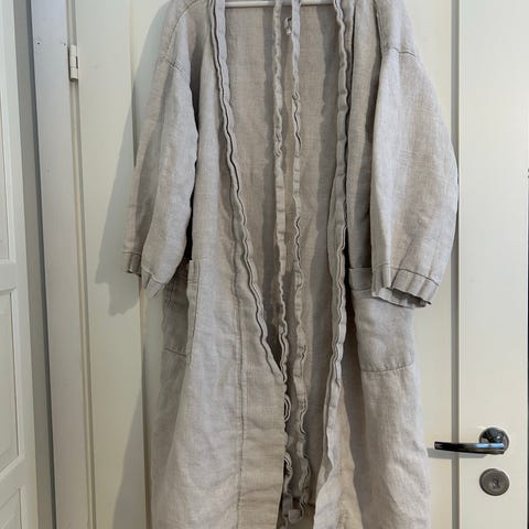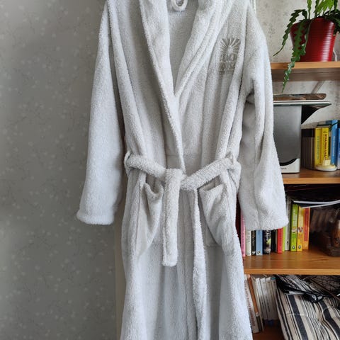 Luhta Home naisten kylpytakki koossa one size, mutta vastaa naisten L kokoa. Väri beige. Materiaalina sekoite, jossa 60 % puuvillaa ja 40 % pellavaa. Kylpytakissa on vyö kiinnitystä varten ja pitkät hihat. Sopii käytettäväksi esimerkiksi kotona, saunassa tai kylpyhetkien jälkeen. Käytetty yhden kerran.
