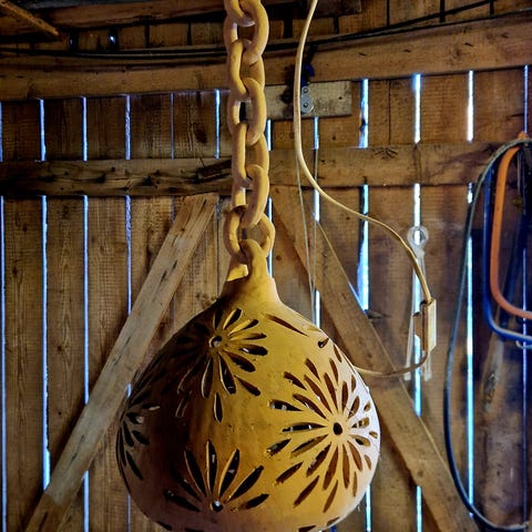 Uusi riippuvalaisin. Paketti avattu ja valaisinta mallattu, mutta todettu ettei sovi meidän paikkaan.