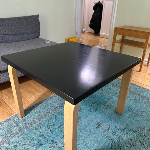 Artek 80B sohvapöytä, koivu valkoisella laminaatilla. Laminaatti pullistunut ulospäin yhdessä pöydän kulmista, muutoin pöytä on hyvässä käytetyssä kunnossa.