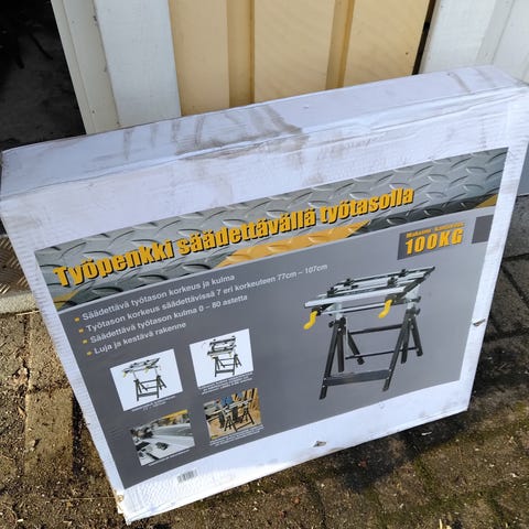 Säädettävä työpöytä ja työpenkki. Runko on metallia ja väriltään musta, pöytälevy puuta. Pöytälevy koostuu kahdesta liikuteltavasta osasta, joita voidaan kiristää sivuilla olevilla kammilla puristimen tapaan. Pinta on varustettu useilla rei’illä kiinnityspaloille sekä mitta-asteikolla. Alhaalla on askelma tai työtaso, joka tukee käyttäjää työskennellessä. Soveltuu esimerkiksi sahaus-, hionta- ja kokoamistehtäviin kotiverstaassa tai autotallissa.