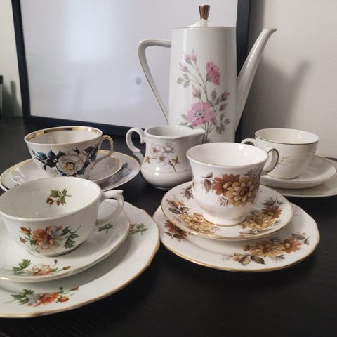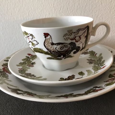 Teekannu, kannu, sokerikko ja kahdeksan kahvikuppia lautasineen. Kannut ja sokerikko hyväkuntoisia. Kupeista ja lautasista on joko kokonaan tai osittain kultaus kulunut (katso kuvat). Toridiili tai nouto Kyröskoskelta. Kulkeutuu mukanani myös Tampereen keskustaan.