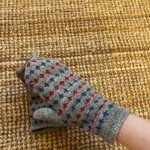 Itse käsityönä tehdyt lapaset seitsemän veljestä langoista.