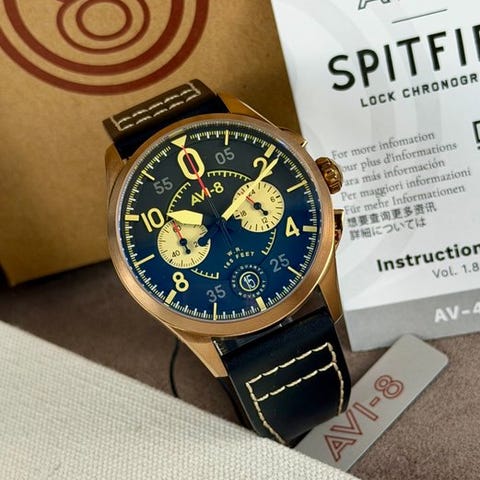 Upea Avi-8-herras kello Spitfire-sarjasta, referenssinumerolta AV-4089-05. Kellossa on quartz-koneisto, ja siinä on kronografinen ajannäyttö sekä päivämääräikkuna klo 6 -asennossa. Kellon osoitinluku on helposti luettavaa taustan värin ja värikkäiden yksityiskohtien ansiosta. Kellolla on urheilullinen ulkonäkö.Uusi ja käyttämätön!Toimitukseen sisältyy kuvatut lisävarusteet.Kellon mukana tuleva nahkaranneke istuu erittäin mukavasti.Koneisto: quartzKellon-kotelon materiaali: teräsLäpimitta: noin 42 mm ilman kruunuaPaksuus: noin 12 mmRannekkeen pituus: noin 21 cm, kellon kanssaIkä: 2020+Toimitetaan vakuutettuna.Kuvat ovat osa kuvausta.