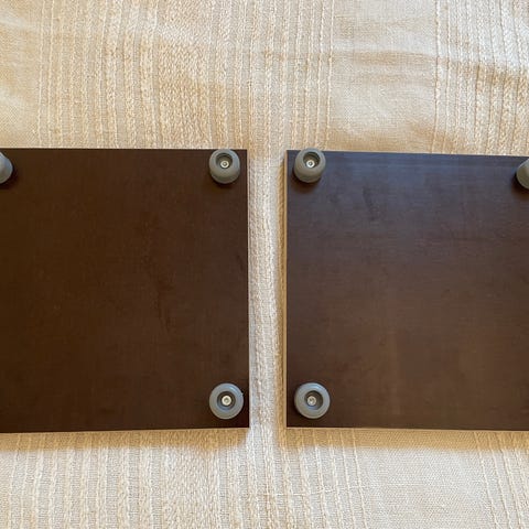 Harjoituslevyt (omavalmisteinen) sivuttaissiirtymän harjoitteluun. Koko 25 x 25 cm x 1,8 cm. Molempien harjoituslevyjen pohjassa on jokaisessa kulmassa kumiset jalat, joiden korkeus 2,3 cm. Mm. urheiluyläasteen testissä kyseinen sivuittaissiirtymä testi.