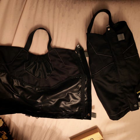 Kuvan tummanvihreät säärystimet. Toisessa nahkaremmin toinen pää riistynyt osittain irti.