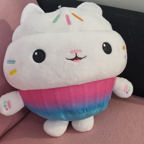 Gabbys nukketalo pehmolelu, vaaleanpunainen kissahahmo. Lelulla on suuret silmät, pieni häntä ja selässä valkoiset perhosensiivet. Pehmolelu on valmistettu pehmeästä kankaasta ja sopii lapsen halileluksi tai sisustuselementiksi lastenhuoneeseen.